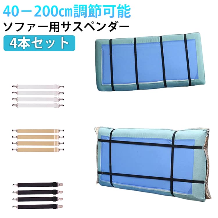 | マルチカバーをソファーの底部から背面でしっかり固定できるサスペンダー。 ソファーシーツのずれを防止する、シーツクリップ同色4本セットです。 金具で長さ調節ができ、強力クリップでがっちり挟むので、外れにくく安心です。 ベルトはゴム製なので、ソファやカバーのサイズに合わせてピッタリとフィットさせ、カバーのズレを防止します。 様々なマットレスやソファーにご使用いただけます。 | |