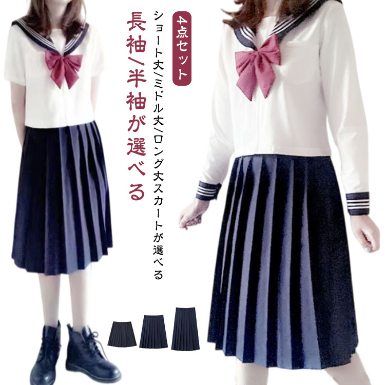 | 【長袖/半袖が選べる】【ショート丈/ミドル丈/ロング丈スカートが選べる】女子高生セーラー服の4点セット。 【セット内容】1.トップス2.スカート3.蝶結びリボン4.黒色ハイソックス すべてそろっているので、すぐに女子高生に変身できます。充実の9サイズ展開! 【ショート丈/ミドル丈/ロング丈スカートが選べる】スカートの長さも3つの選択があります。 【素材】綿混ポリエステル生地のため、皺がつきにくく扱いやすい素材を使用しています。 【リボン】結んだ状態で固定されているため、結ぶ手間が必要なくいつでもきれいな形をキープできます。 【イベントで大活躍】ハロウィン、仮装パーティ、忘年会、 新年会、 学園祭 、文化祭、演出ショー、撮影会 、各種イベントなど、使い方はあなた次第! | |