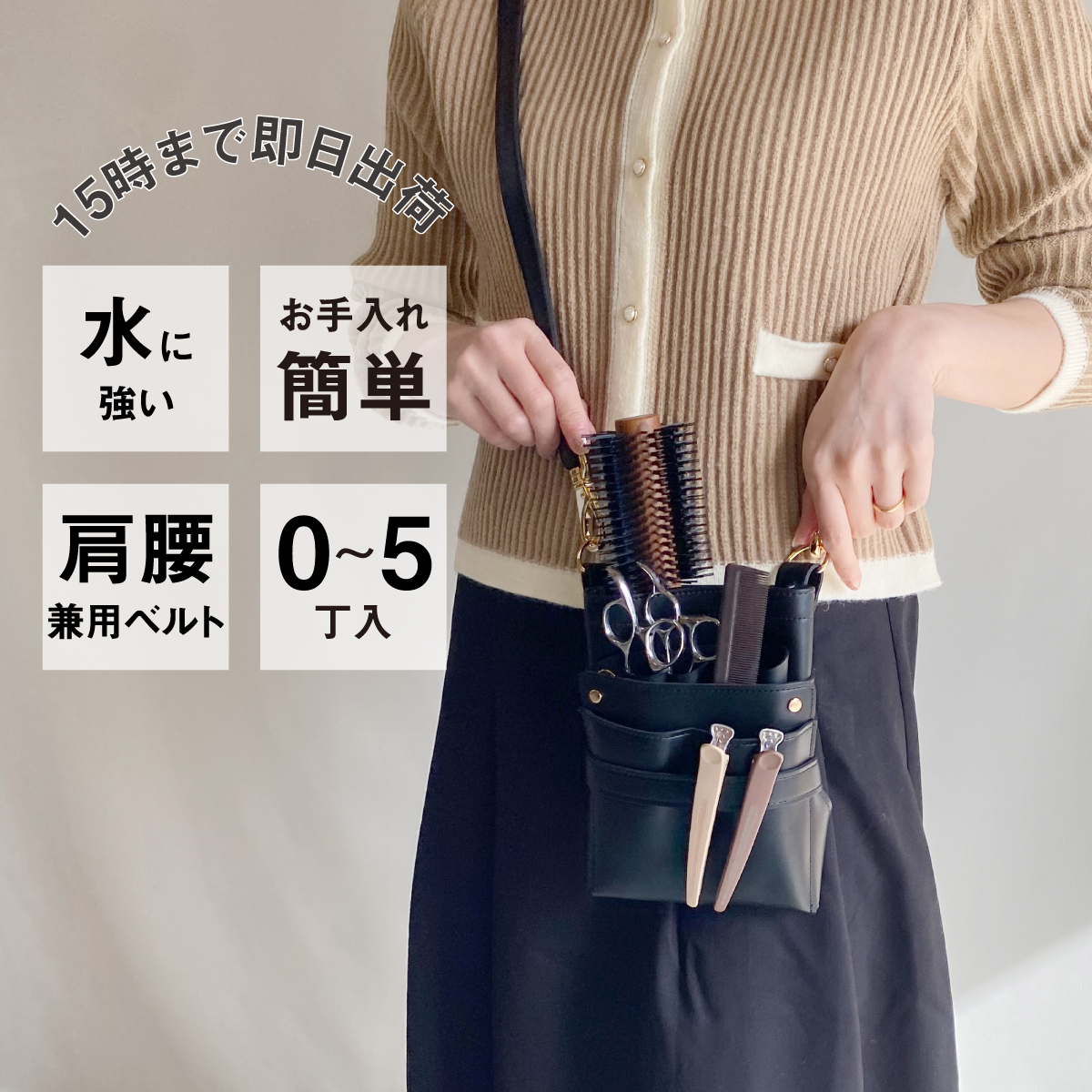 シンプルな色なのでどんなコーディネートにも合わせやすくオススメのシザーケースです。