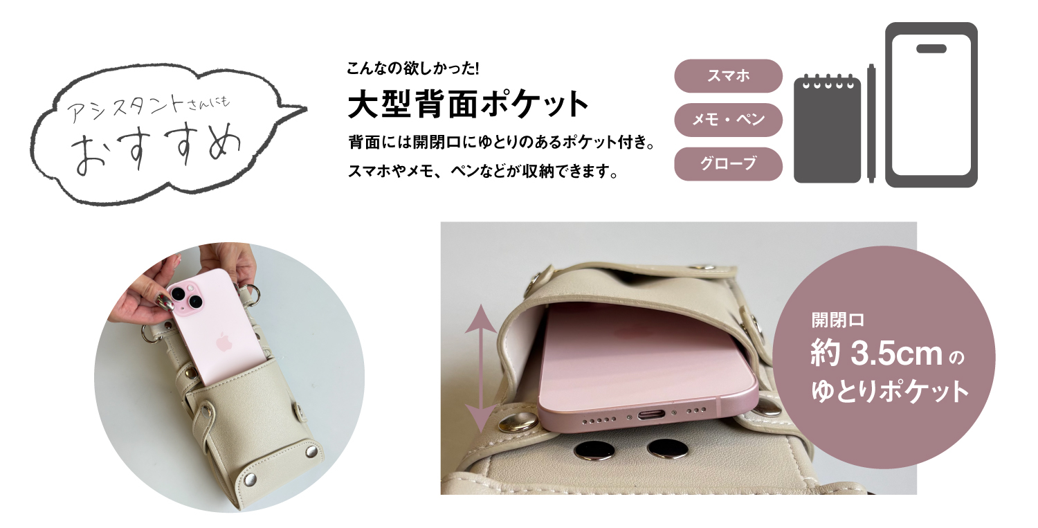・裏面にメモ帳やスマホを収納できるポケット付き
