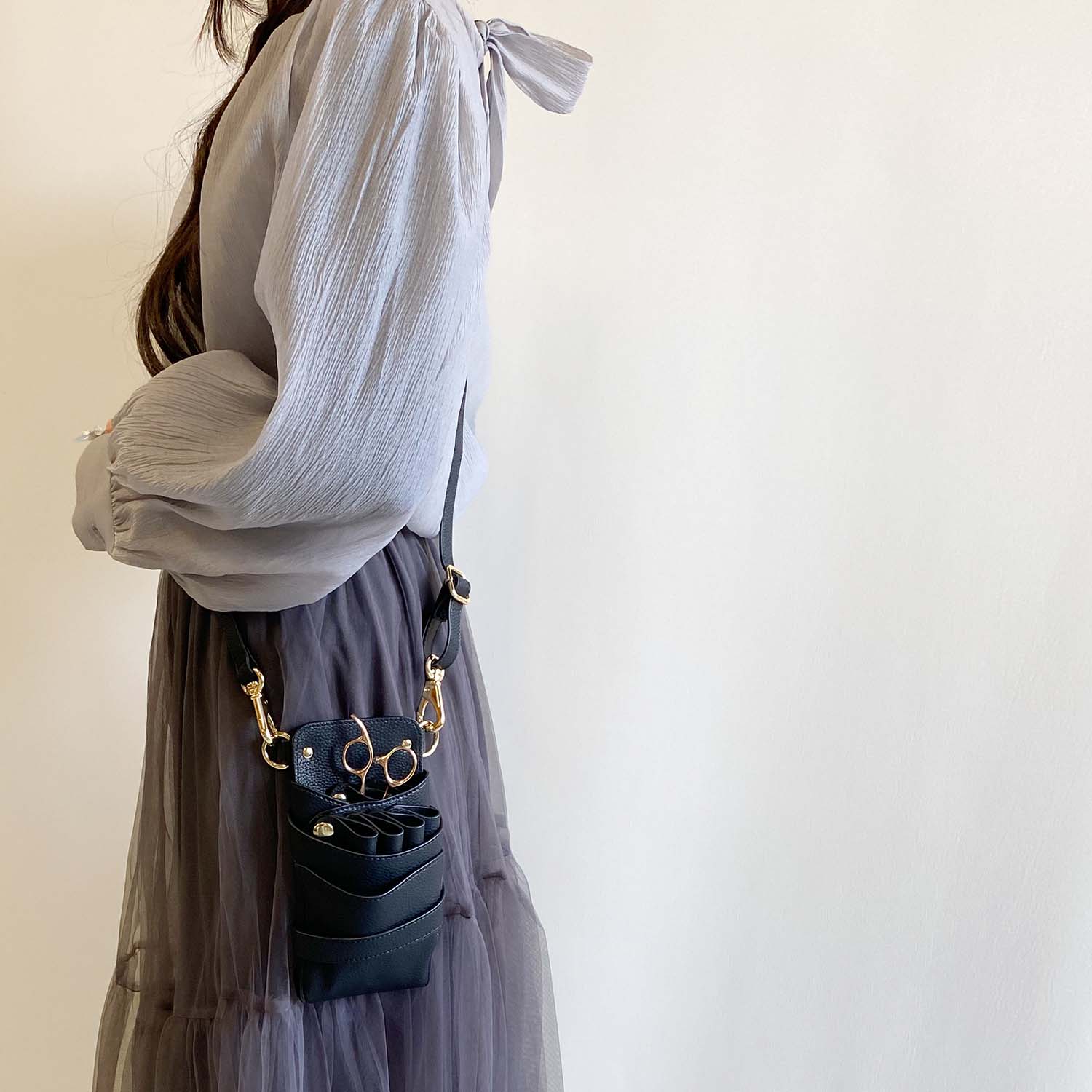 シボ素材のブラックのPUレザーにゴールドの金具を使用したお洒落なシザーケースです。