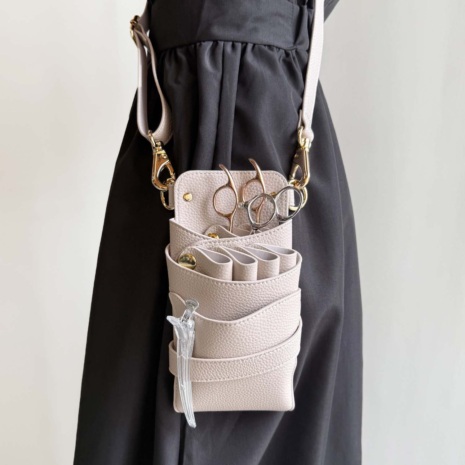 シボ素材のライトグレージュのPUレザーにゴールドの金具を使用したお洒落なシザーケースです。