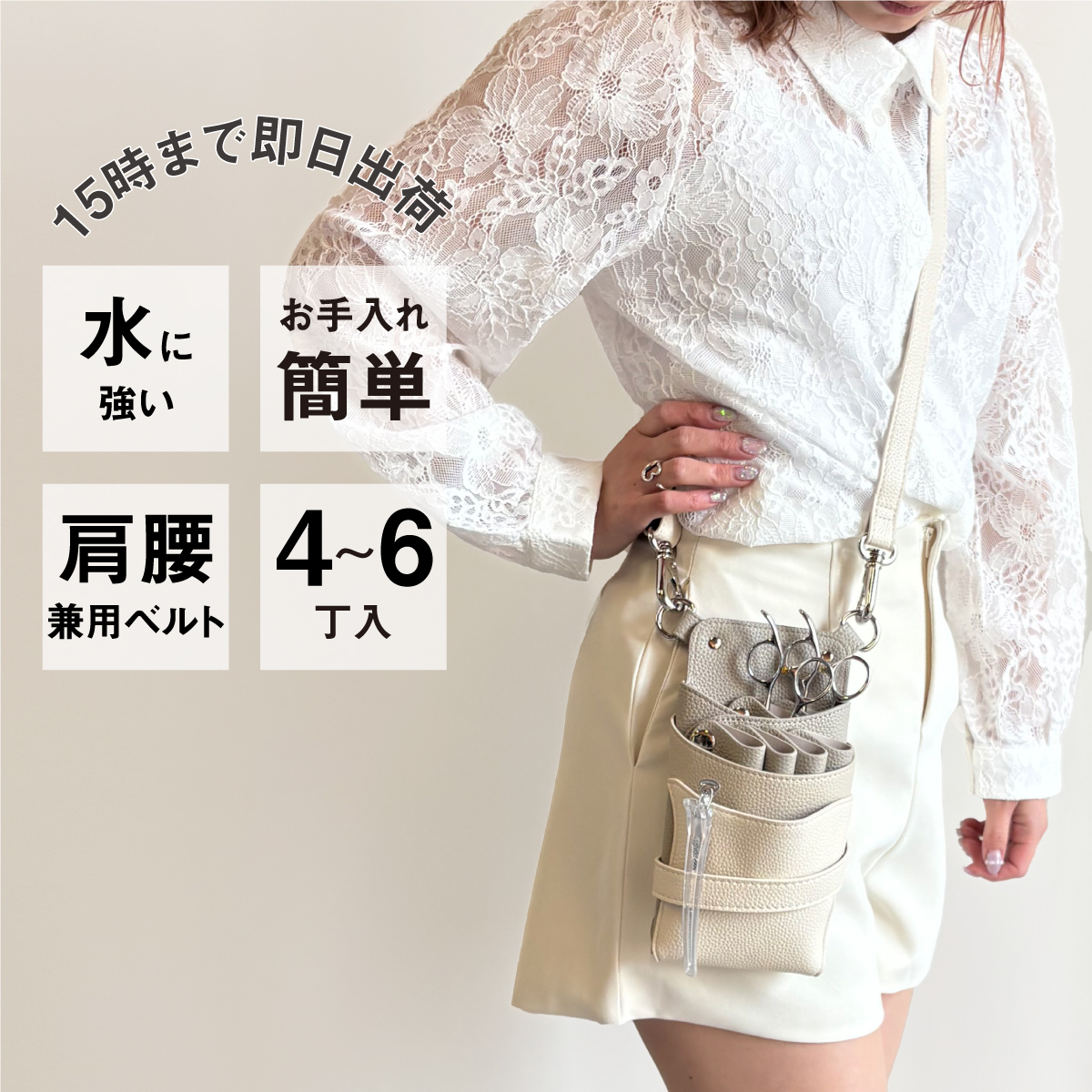 シボ感のあるグレージュ×ライトグレージュ×アイボリーのPUレザーにシルバー金具を使用したお洒落なシザーケースです。