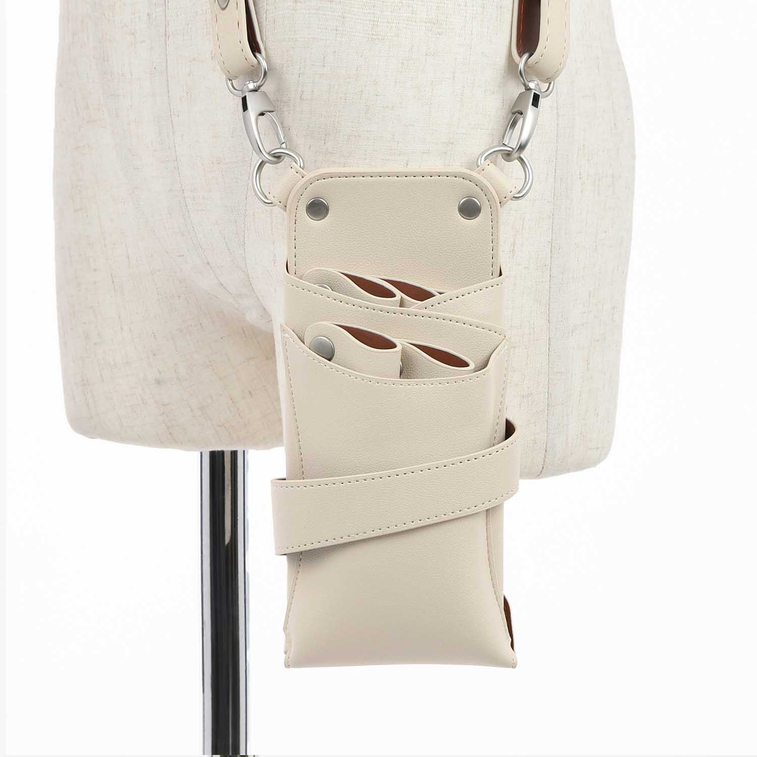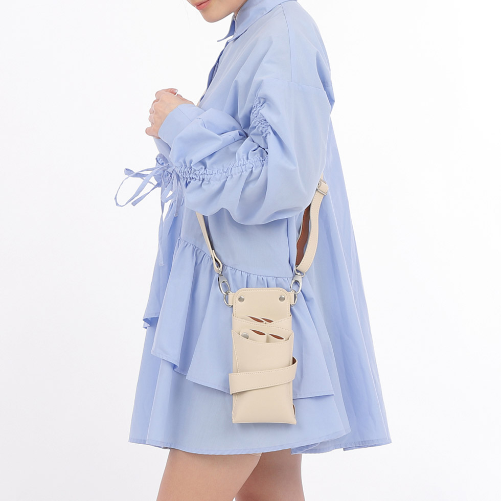 マットな風合いのアイボリーのPUレザーに、シルバーの金具を組み合わせたお洒落なシザーケースです。
