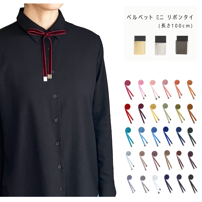 ![]() 美しい光沢と滑らかな質感 ベルベット リボンタイ ミニサイズ。 お手持ちのシャツやブラウスに結ぶだけで、 手軽にイメージチェンジが楽しめます。 リボンは32色、金具は3色から選べるので、 きっとお気に入りのデザインが見つかるはず。 \お客様の声から生まれました/ 「もう少し短いサイズはないですか?」 とお客様からお問い合わせがありました。 襟元で収まるリボンタイの写真が添付されており、 恐らくお子様用に探されているご様子でした。 既にショート(120cm)があったのですが、 今回更に短いミニ(100cm)を商品化する事になりました。 ![]() ![]() ![]() | |||||||||||||
