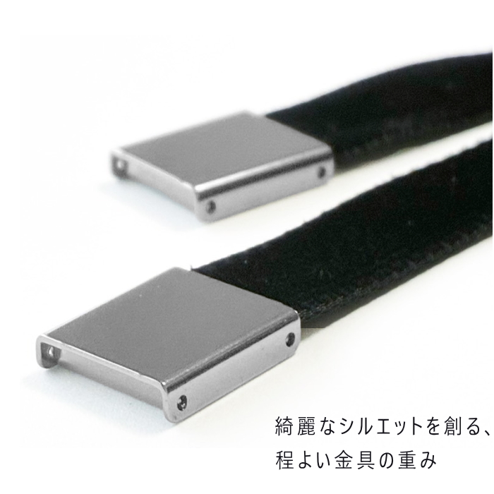 ![]() お手持ちの白シャツやブラウスとの組み合わせはシンプルながらも、リボンタイがアクセントとなり、洗練された上品なコーディネートが完成します。 ジャケットと合わせれば、オフィスや特別なイベントでも活躍する装いに。さらに、ワンピースに合わせると華やかさが際立ち、フォーマルシーンに最適です。 また、ジーンズやカジュアルアイテムとも相性が良く、こなれ感のあるおしゃれを楽しめます。 ![]() このページはショートサイズ(長さ120cm) ![]() 高級感がある、美しいベルベットリボンは日本製で、独特の柔らかさと上品な艶が魅力的です。細幅のデザインは華奢でモードな印象を与え、洗練されたアクセントを加えます。 また、なめらかな肌触りが首元に優しくフィットし、一日中着けていても快適です。 ![]() ベルベットリボンの端に付けられた程良い重みの金具は、シルエットを綺麗に保つためにデザインされています。 ![]() リボンタイ 全体像 ![]() dplus arts(ディープラスアーツ)のベルベット リボンタイは、シルバー、ゴールド、ブラックニッケル(濃いグレー)の3色の金具から選べます。これらの金具はリボンのデザインを一層引き立て、個性を演出します。 フォーマルやカジュアルコーディネートにも柔軟に対応する為、様々なスタイルにマッチ☆ Color Variation ![]() ![]() ![]() ![]() ![]() ![]() ![]() ![]()