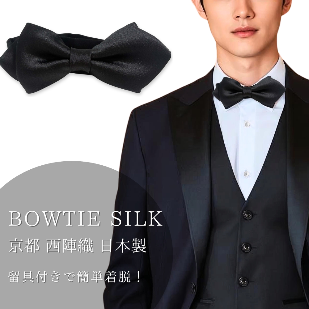 伝統のある 京都「西陣織」シルク 生地は着物の産地として長い伝統を誇る「 京都 西陣織 」を使用した蝶ネクタイです。 伝統に裏打ちされた品格は、身に着けた人に満足感や特別感を味わって頂けるはず。 ![]() ワンタッチで簡単装着 首回りのサイズ調整可能 慌ただしい着替えの時も安心なワンタッチ式の簡易留め具を採用。着脱が簡単&首回りの長さも自由に調整可能です。 ![]() 丁寧な縫製、京都 日本製 西陣織を織り上げる機場の風景。長い歴史の中で培われた織物の伝統が今も息づいています。 dplus artsの黒蝶ネクタイは伝統の技から生まれた上質な無地の西陣織を使用し、現代の装いに洗練された個性を加えます。 普段使いから特別な日まで本物のシルクが品格を演出します。ドライクリーニングを推奨しております。 | |||||||||||||||||||||||