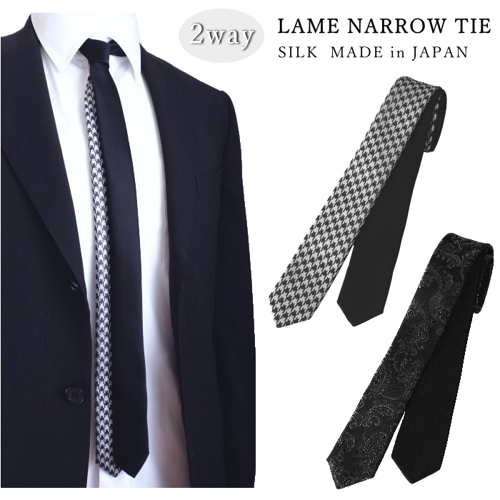 1本で2柄楽しめる 細い ネクタイ ナロータイ シルク ラメ 黒 無地 柄 4cm 2way 京都 西陣織 日本製 メンズ レディース dplus arts メール便