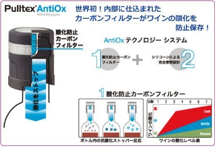 シリコンストッパー内部に仕込まれたカーボンフィルターがワインの酸化を防止保存!ボトル内残量が半分の場合で約5?10日(ワインの酒類やそれまでの保存品質環境にもよります)ワインの酸化を防止する画期的なストッパーです。日々のお食事にも、もちろんプレゼントにもお使いいただけます。