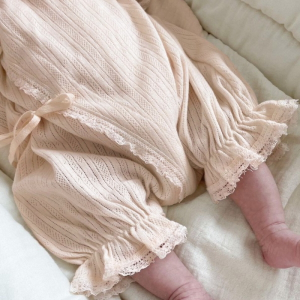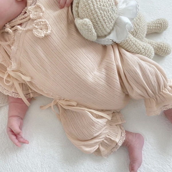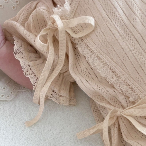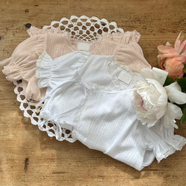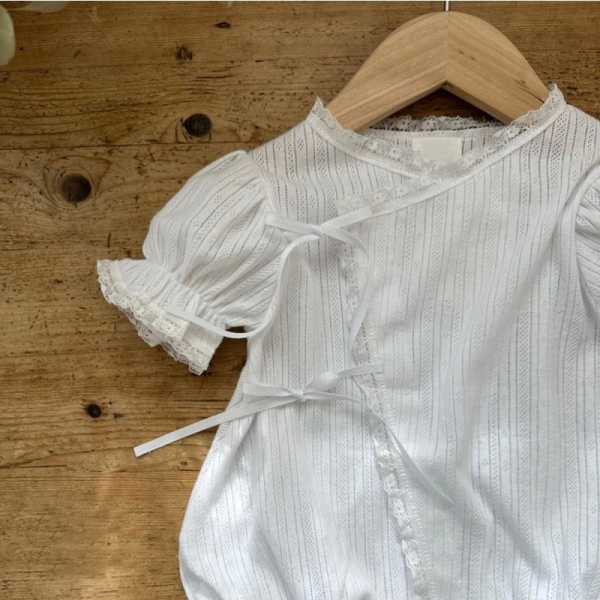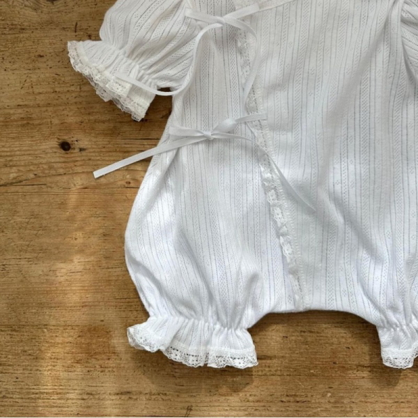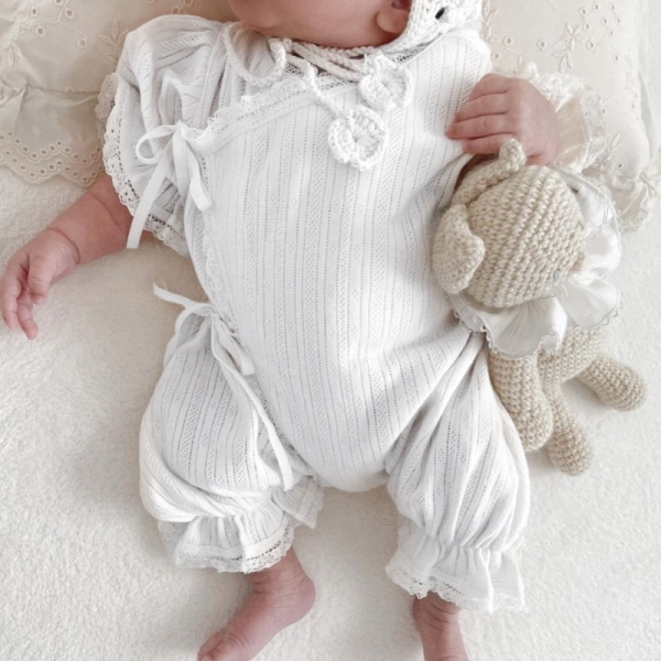 【即納】カバーオール レースドッキング ホワイト 90 ベビー服 赤ちゃん 服 新生児 退院着 半袖 紐 ナチュラル ガーリー 前開き 北欧 韓国