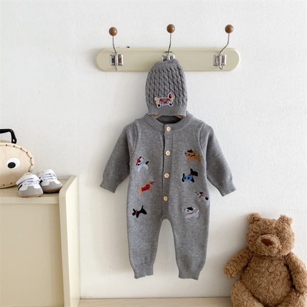 在庫あり 帽子付き ニット オールインワン グレー (73) ベビー服 赤ちゃん 服 秋冬 韓国風 ロンパース ニット セーター カバーオール 男女兼用