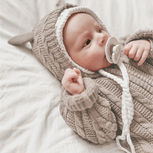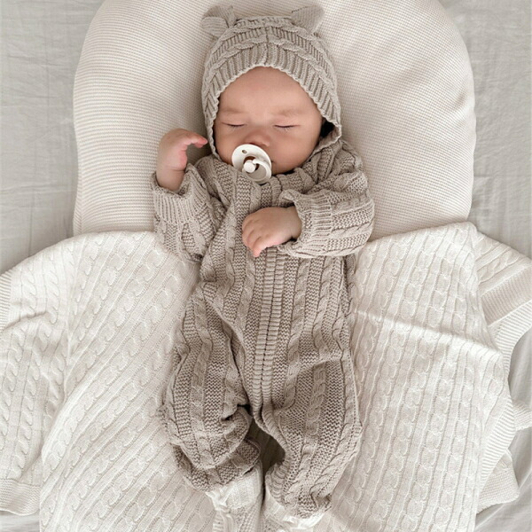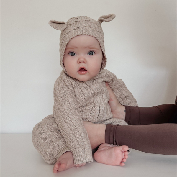 在庫あり アラン模様 ニット オールインワン グレー (73)ベビー服 クマ耳 赤ちゃん 服 秋冬 韓国風 ロンパース ニット セーター カバーオール 男女兼用