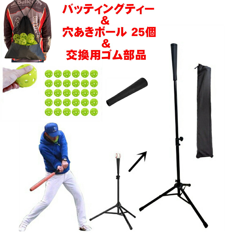 【セット内容】:穴あきボール×25(収納袋付)、バッティングティー×1(収納袋付)、交換用バッティングティートップ部品×1