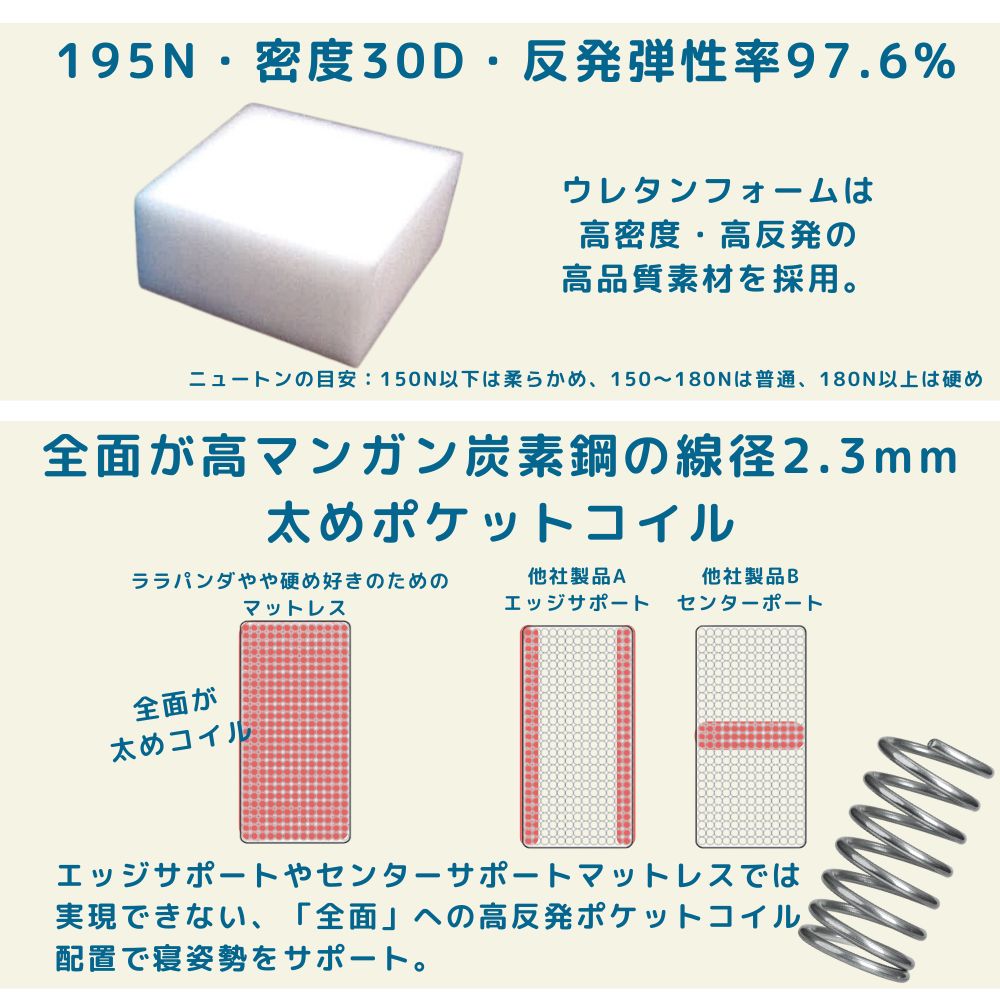 マットレス種類:ポケットコイルマットレス、コイル直径2.3mm、コイル高さ19cm、コイル数713個、並列配列