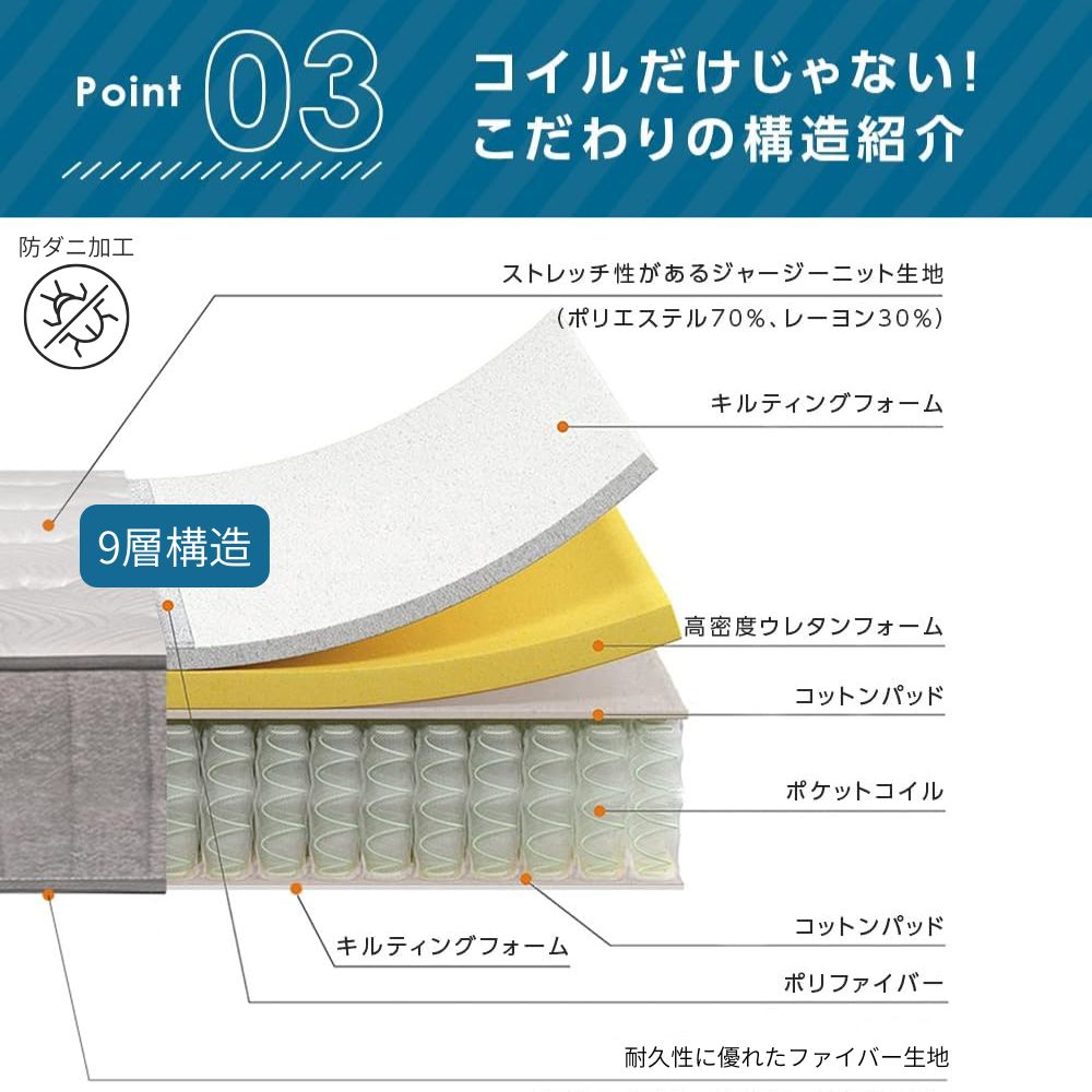 ★ポイント3:厚さ23cm、快眠をサポートするこだわりの9層構造