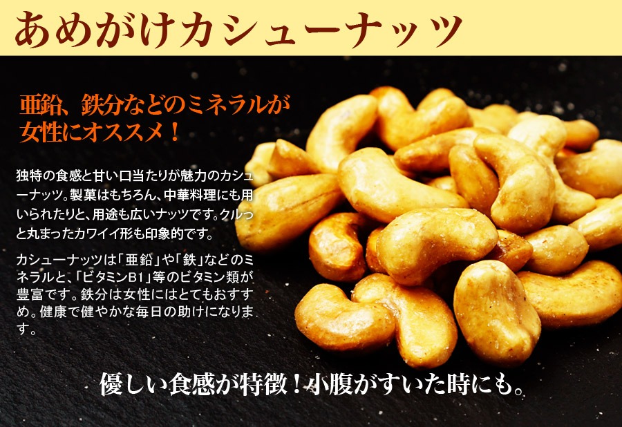 【カシューナッツ】カシューナッツ(インド産)、砂糖、水飴、植物油脂/乳化剤、(一部に大豆・アーモンド・カシューナッツを含む)