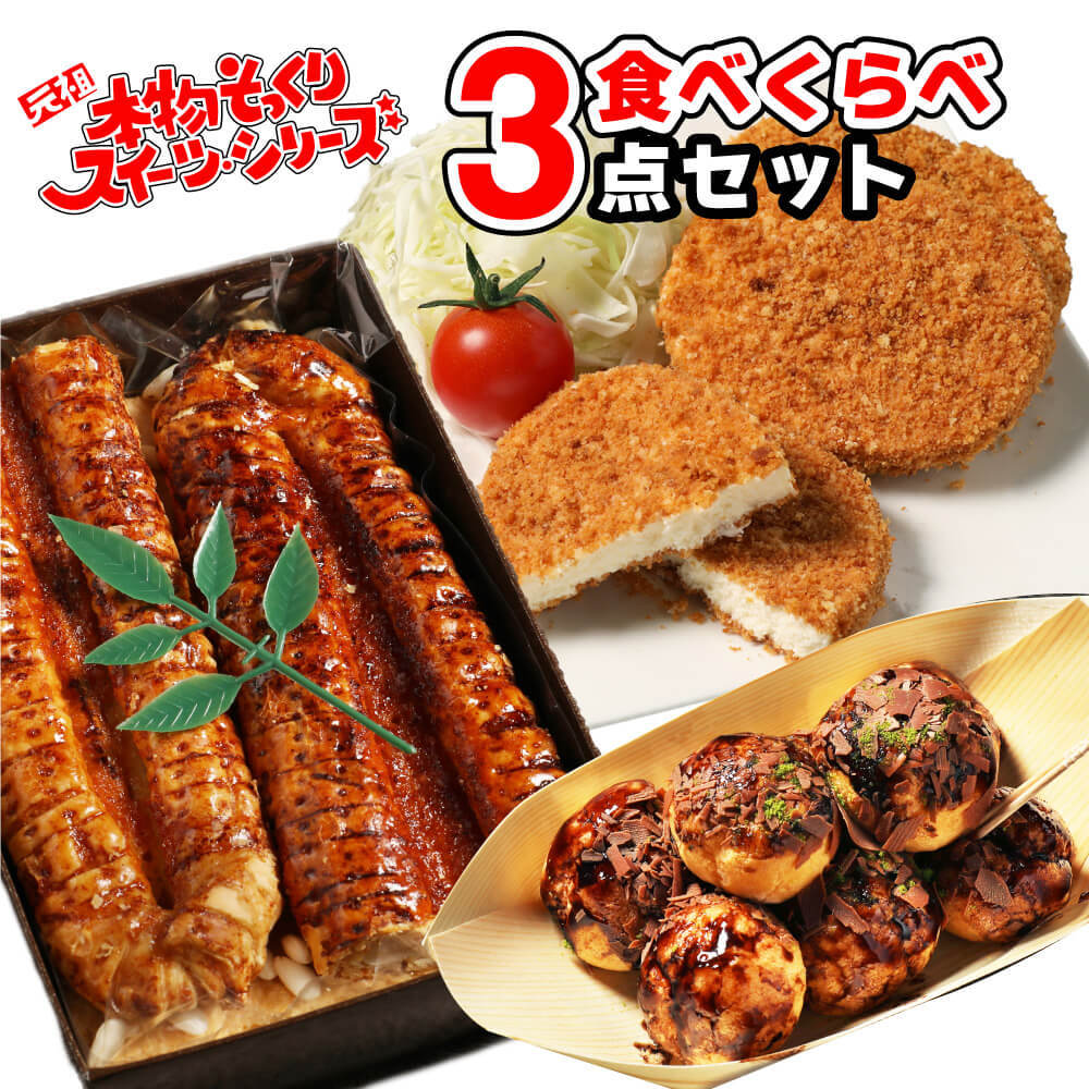 元祖そっくりスイーツシリーズの人気商品3点(たこ焼きにしか見えないシュークリーム、コロッケそっくりなレアチーズケーキ、うな重そっくりなミルフィーユ)をセットにしました。