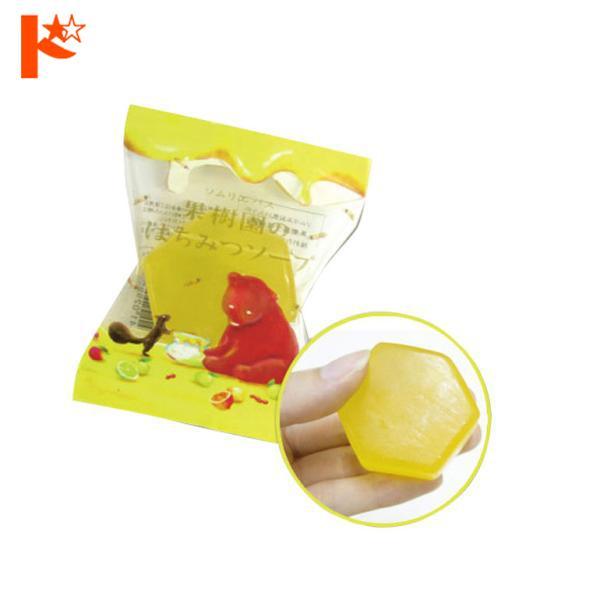 ■はちみつ色の六角形のミニソープです。植物石けんなのでお肌にやさしい仕上がりになっています。ゲストループや旅行に便利なサイズです。フルーツとはちみつの甘い香りになっています。