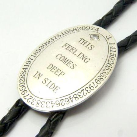 槌目加工されたループタイ(トップ)。メッセージの上ににCZが留めてあります。「この感覚は心の奥深くから来るものだ」