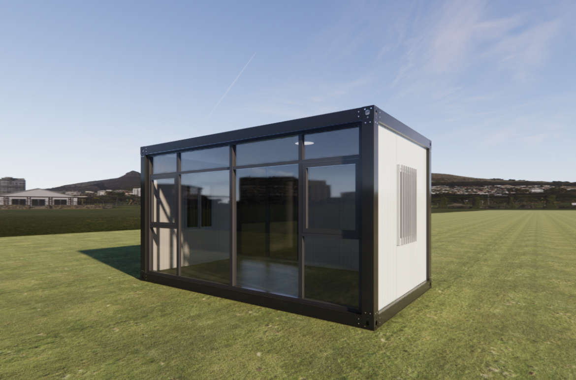 このシンプルなデザイン以外にも、前面ガラス張りや、さらに大きな連結タイプなど、たくさんのプレハブハウスを販売しております。