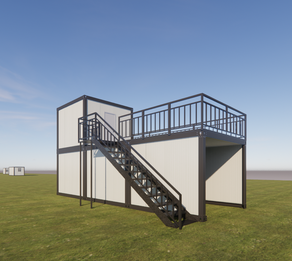 ユニットハウスを計4棟連結し、更に屋上デッキを取りつけ、ルーフバルコニーのようにご使用いただけます。