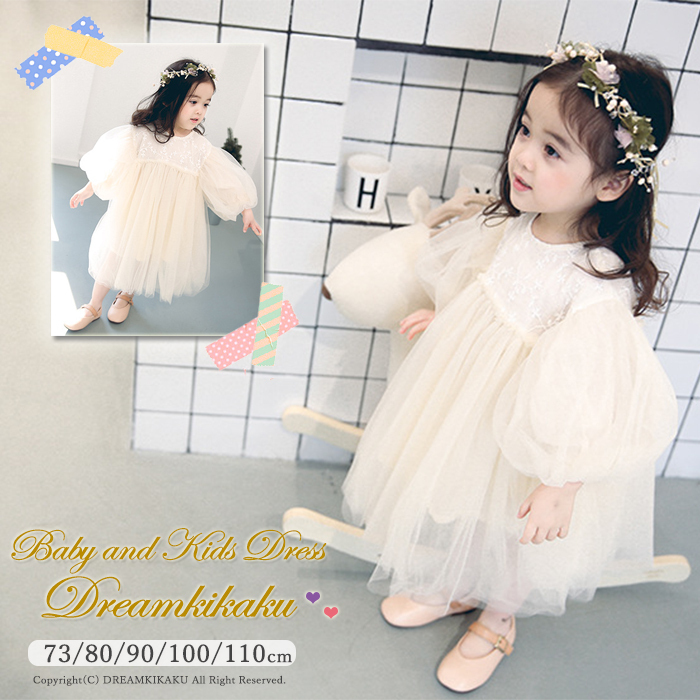 子ども ワンピース ベビー ドレス アイボリーのふんわりチュール袖 ワンピース レース フォーマルにも チュール チュチュ スカート レース パフスリーブ 新生児 73/80/90/100/110 春 夏 ホワイト アイボリー