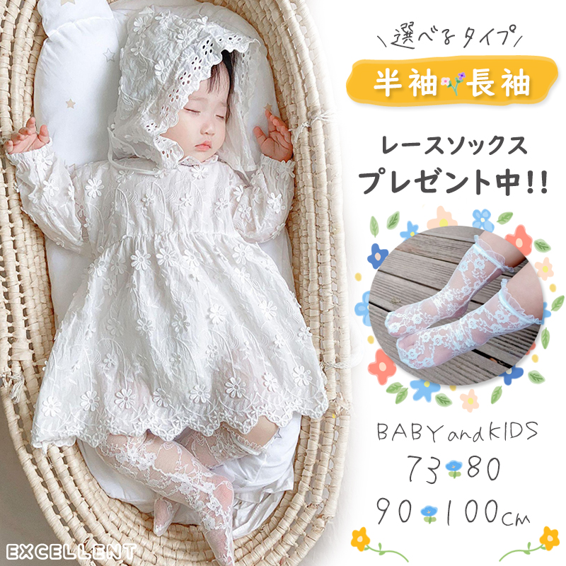 ベビードレス 結婚式 半袖セレモニードレス 出産 新生児 お宮参り 長袖 ベビー用 ドレス 白 レース刺繍 帽子付き 靴下付き 赤ちゃんドレス ベビー 出産祝い