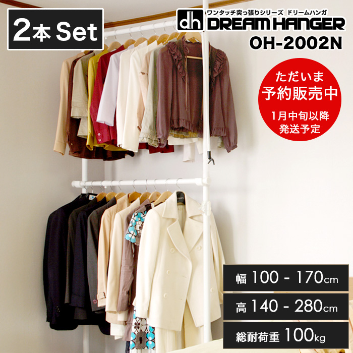 【1月中旬入荷予定】【簡単設置】【2本セット】ワンタッチ式突っ張りポールハンガーラック 2段 幅100-170cm 高140-280cm 室内干し 大量収納 OH-2002N 正規品