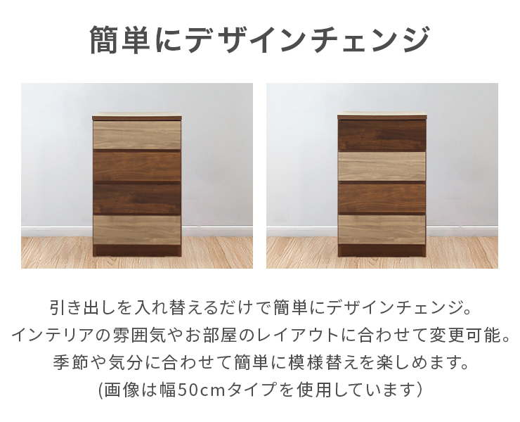 | ・国産品(日本製)、完成品 ・引き出しには全段スライドレール付き ・引き出しを入れ替えることでデザインチェンジが可能 ・本体重量約22kg |