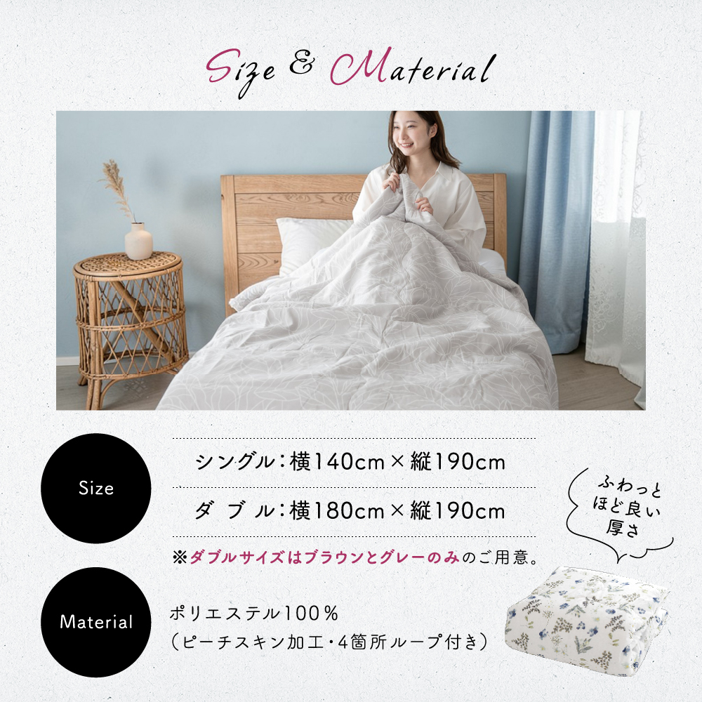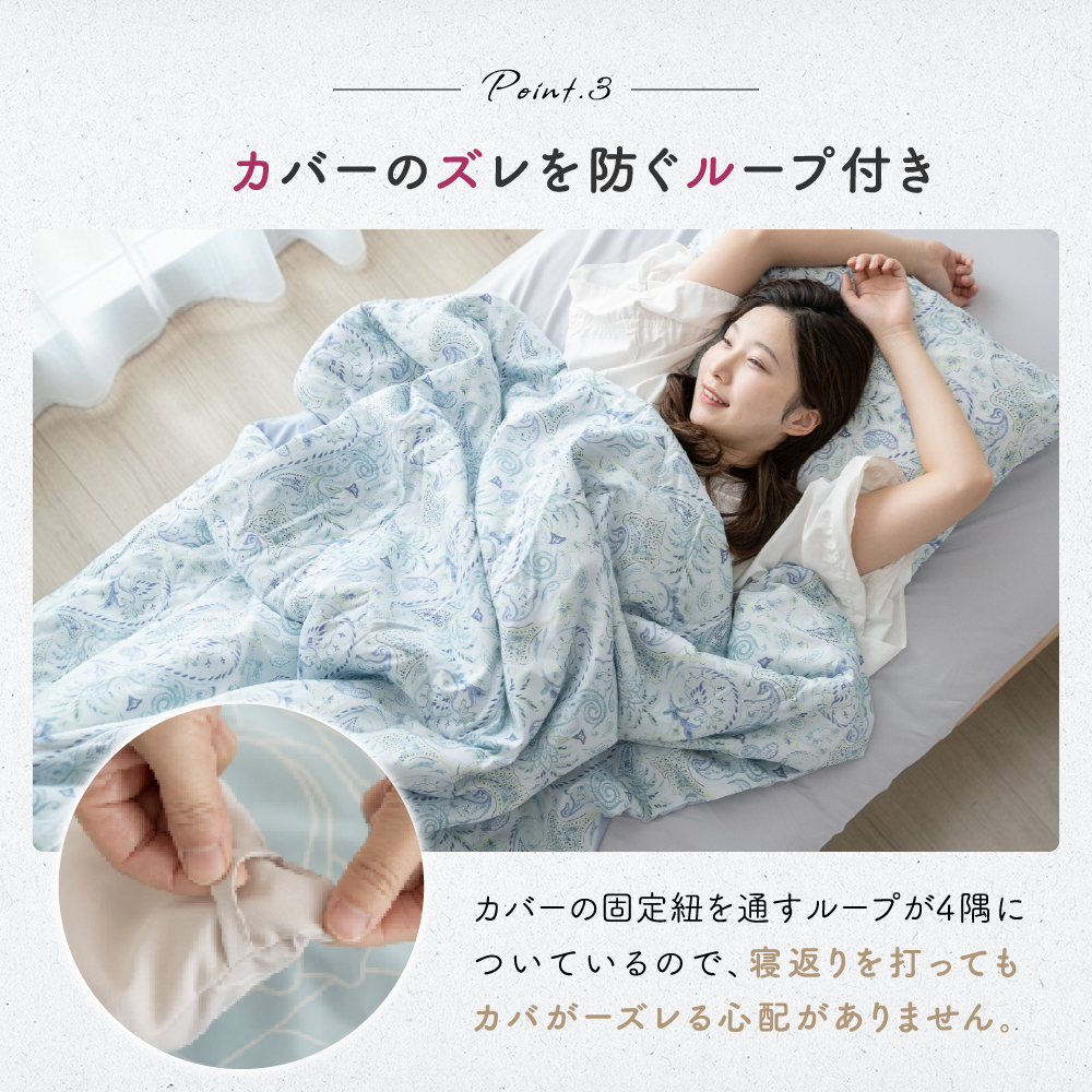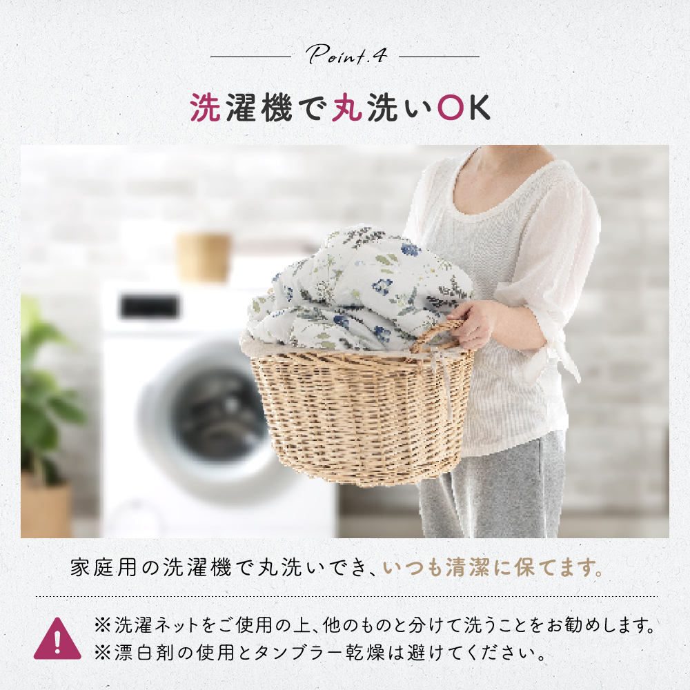 お洗濯後、干す前に軽く叩いて中綿の偏りを均一にならしていただくと、乾いた時にふんわりと仕上がります。