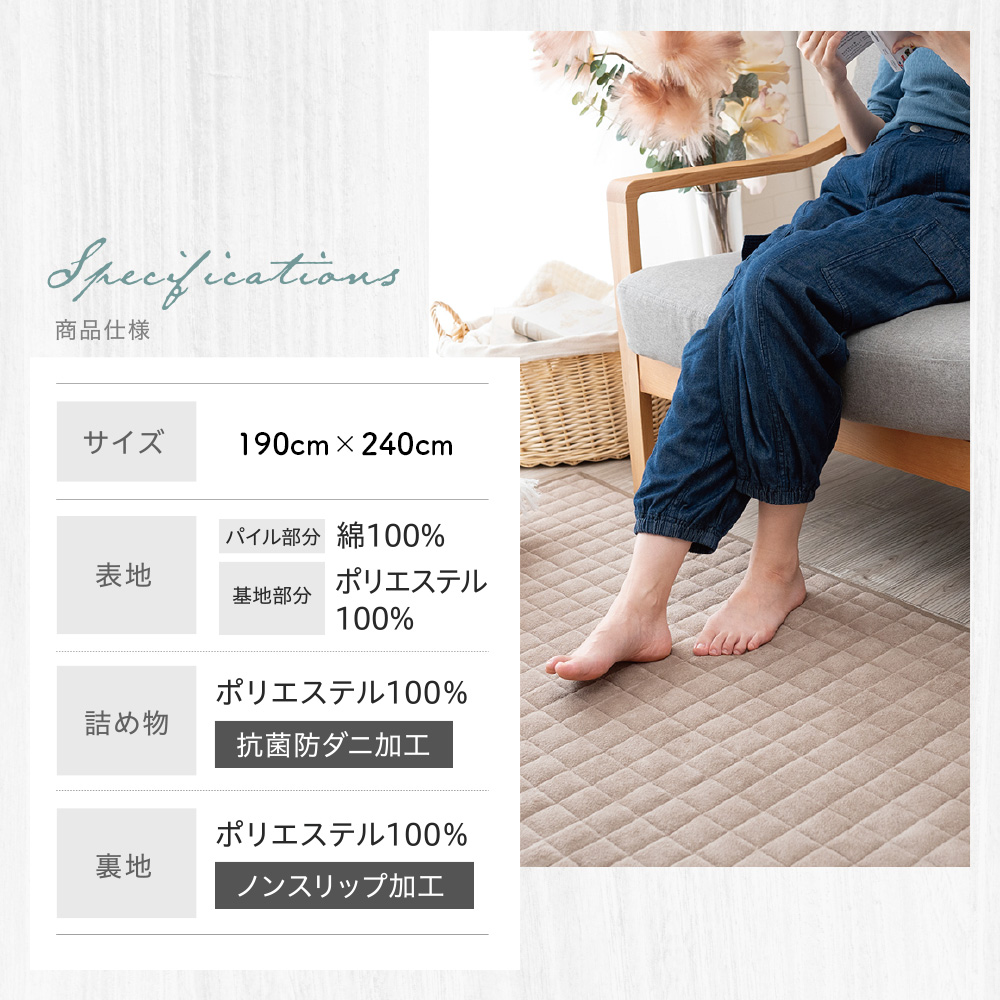 ラグ 洗える 綿100% カーペットカバー 3畳 タオル地 抗菌防臭 パイル 防ダニ おしゃれ ぽこぽこ キルト コットン タオル ラグ 滑り止め 綿 汗取り 190×240cm