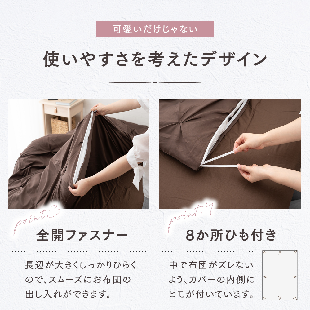 【全開ファスナーで布団の着脱が簡単】