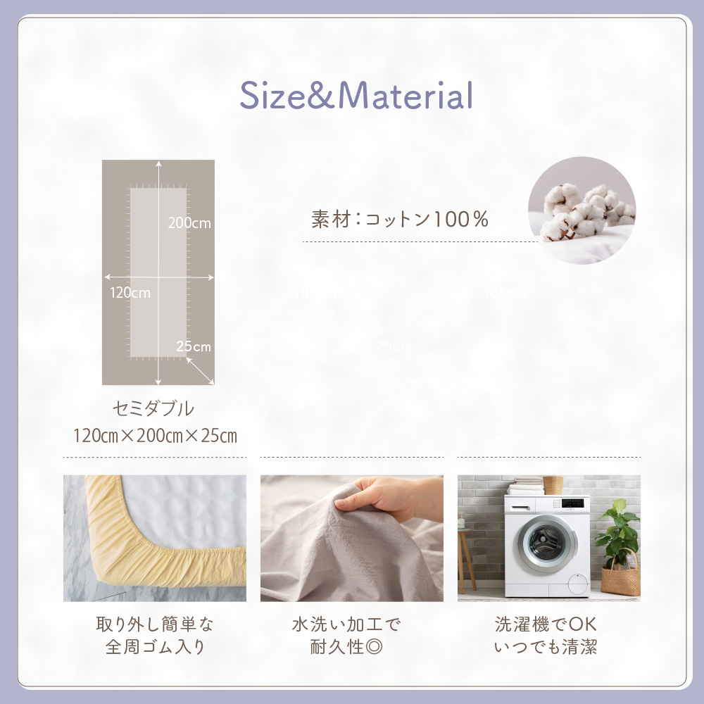 ボックスシーツ 綿100% セミダブル ベッドシーツ 綿洗いざらし マットレスカバー くすみ ベッドカバー マットレスシーツ 北欧 おしゃれ マチ25cm 120×200cm