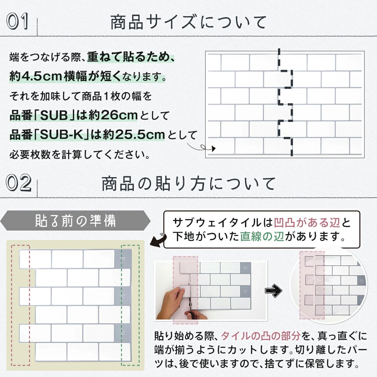 ・初心者でも簡単かつ綺麗に貼れる工夫が施され、接着材や目地材は不要。台紙から剥がして貼り付け、好きな位置でどの部分も切れます