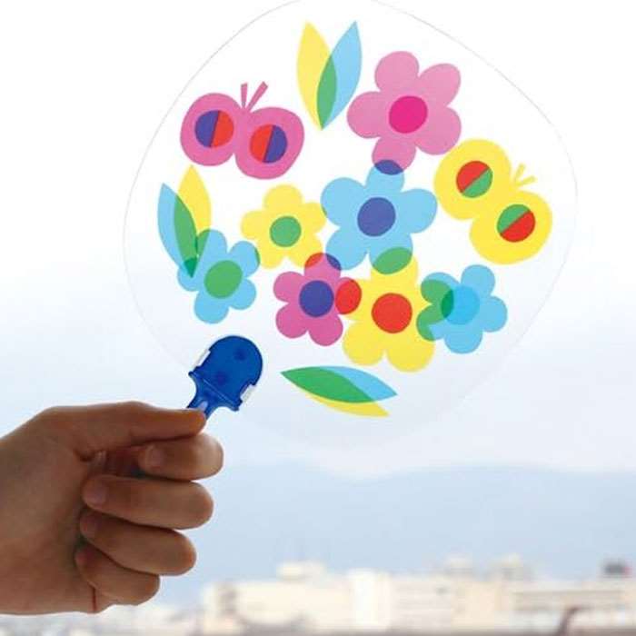 3色の粘着付セロハンでステンドうちわ作り。油性マジックで絵が描けます。オリジナルのうちわを作って涼しく楽しもう。夏休みの工作としても最適。