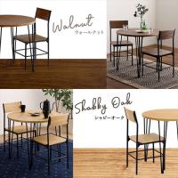 ヴィンテージ円形ダイニング3点セット。カラーは、シャビーオーク(4535306217631:CRV-3--SBO)、ウォールナット(4535306217648:CRV-3--WAL)、です。天板サイズ80cm幅のヴィンテージ円形ダイニング3点セット。ブラックスチールと木目の相性がバッチリです。2人掛けにはちょうどいいサイズです。円形だとコミュニケーションがとりやすくなるので、お互いの顔が見やすく楽しく過ごせます。角型テーブルじゃないので、角にぶつかってもケガの心配がないです。どこからでも座ることができ、席に座りやすいのが特徴です。イスは背もたれ付きなのでゆったり座れます。