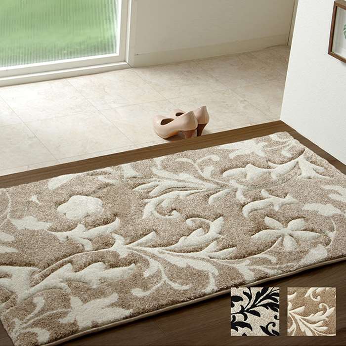 ウィルトン織りの玄関マットです。カラーは、ブラック(4550317068300:2051169)、ベージュ(4550317068331:2051269)、です。カービング仕様で立体感のある商品です。ウィルトン織りは非常に耐久性の高い織物です。家の中でも靴を履いて生活するヨーロッパで,土足で扱うことを前提として作られておりますので,長時間踏みつけてもヘタリにくく,弾力性もあり長くご使用頂けます。本商品の『繊維の密度を表すノット数』は128,000ノットです。本商品のパイル部分にはポリプロピレン素材を使用しております。ポリプロピレンはヘタリにくく,耐久性に優れ,繊維の中でも軽い素材です。また,汚れが付着しにくく,遊び毛や毛玉が非常に出にくいという特徴もあります。落ち着いた色味で高級感がでます。抗菌・防臭,消臭機能がついていますので,臭いが気になる玄関でも安心してお使いいただけると思います。目付は13mmで通常よりも少し多く肌触りも良いです。