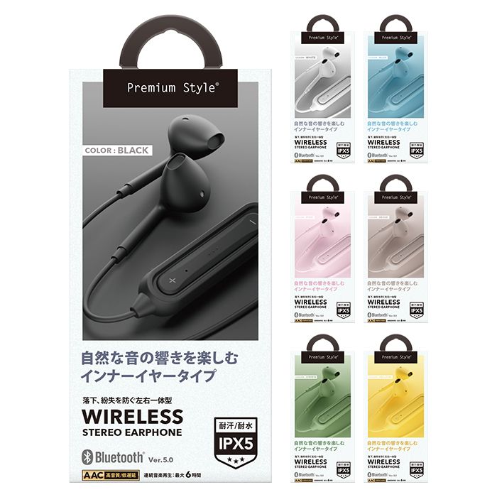 耳に負担の少ないインナーイヤー型ワイヤレスステレオイヤホンです。カラーバリエーションは、ブラック(JAN:4562358115400/品番:PG-BTE12IE1BK)、ホワイト(JAN:4562358115417/品番:PG-BTE12IE2WH)、ブルー(JAN:4562358115424/品番:PG-BTE12IE3BL)、ピンク(JAN:4562358115431/品番:PG-BTE12IE4PK)、ベージュ(JAN:4562358115448/品番:PG-BTE12IE5BE)、グリーン(JAN:4562358115455/品番:PG-BTE12IE6GR)、イエロー(JAN:4562358115462/品番:PG-BTE12IE7YE)です。省電力、高速通信のBluetooth(R) 5.0搭載で高音質・低遅延の「AAC」にも対応し快適な音質を楽しめます。イヤホン部は心地のよい装着感のインナーイヤー型を採用し、長時間の使用にも最適なデザインとなっています。ケーブル部に音楽再生/停止、着信応答/終話が快適にできるマイク付きリモコンを搭載。また、IPX5防水相当の防滴対応なのでランニングやスポーツ時の汗など日常生活の中での防水・防汗設計を備えています。[連続音楽再生時間:最大6.0時間] [連続通話時間:最大6.5時間][連続待ち受け時間:最大75時間][イヤホン充電時間:約2時間]