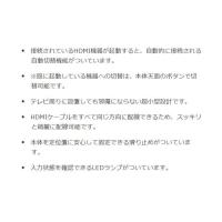 複数のHDMI機器の映像・音声を切り替えて1台のテレビに出力ができるHDMI切替器です。HDDレコーダー、BD/DVDプレーヤー、ゲーム機(PlayStation(R)4、Nintendo Switch(TM)など)、ChromecastなどのHDMI機器を3台接続可能です。テレビのHDMI入力端子が不足していても、ケーブルの差し替えをせずにHDMI機器を利用可能です。HDMI機器から電力を供給するため、ACアダプタなど外部電源を必要とせずに利用可能です。HDMI機器からの電源供給が少ない場合でも、安定動作ができるようにするための外部電源ポートがついています。必要に応じて本体側面の外部電源ポート(USB micro-B端子)に電力を供給してください(※USBケーブル・ACアダプタは別売です) 。接続されているHDMI機器が起動すると、自動的に接続される自動切替機能がついています。※既に起動している機器への切替は、本体天面のボタンで切替可能です。テレビ周りに設置しても邪魔にならない超小型設計です。HDMIケーブルをすべて同じ方向に配線できるため、スッキリと綺麗に配線可能です。本体を定位置に安心して固定できる滑り止めがついています。入力状態を確認できるLEDランプがついています。