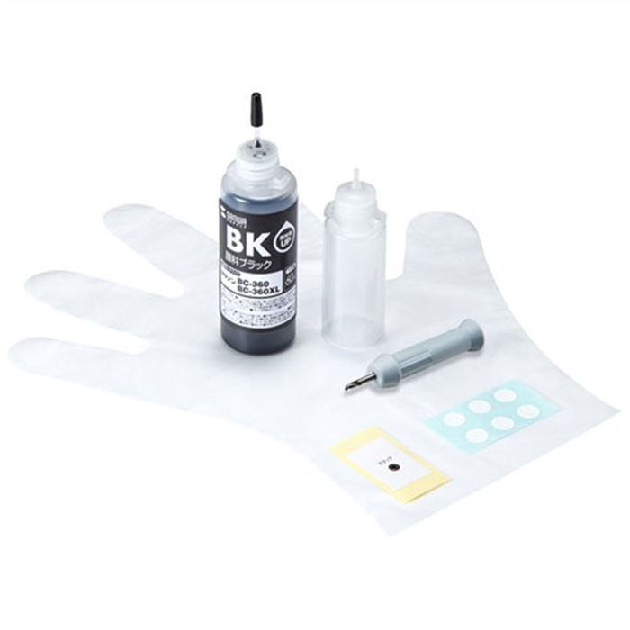 キヤノン用つめかえインクです。BC-360/BC-360XL対応つめかえインクです。初めての人の工具付きセットです。