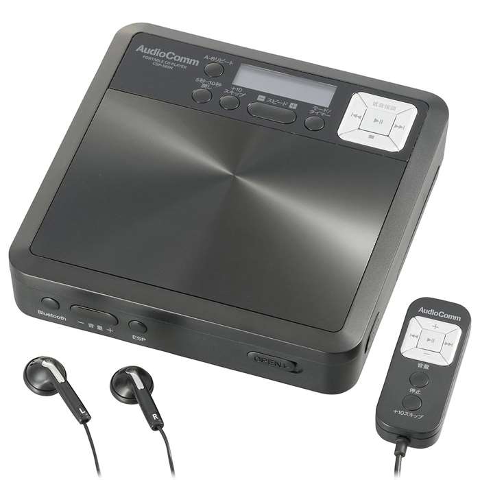 語学学習に役立つ機能が充実。・繰り返して覚える(リピート/ランダム/A-Bリピート機能)・レベルに合わせてスピード調整(再生スピード11段階コントロール)・すぐに戻せる(5秒・30秒ワンタッチプレイバック)・就寝前でも安心(オフタイマー 10〜60分/10分間隔)・らくらくスキップ(10ファイルダイレクトスキップ)。Bluetooth搭載でワイヤレスイヤホン/スピーカーなどに出力できます。レジューム再生(電源切→入時に前回の続きから再生)機能付き。低音強調機能付きで迫力ある音楽再生ができます。ESP(音飛び防止)機能付き。MP3ディスク再生対応。LINE OUT(音声出力)端子付きで外部アクティブスピーカーと接続できます。乾電池/USB2電源対応(USB電源コード付属)。再生/一時停止、音量調節、スキップができるコントローラー付属。ホールド機能でボタンの誤操作を防止。立てて使えるスタンド付き(本体一体型、2段階調節)。ステレオイヤホン付属。本体カラーはブラック。