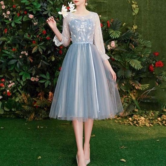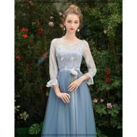 結婚式 ドレス 青 水色 チュール シフォン 長袖 フレア レース フェアリー シースルー バックシャン 花柄 刺繍 編み上げ かわいい 20代 30代 送料無料