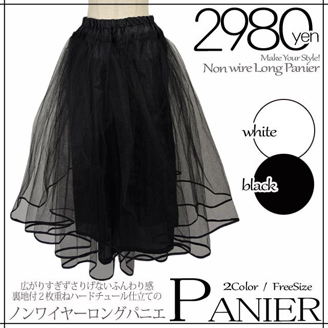 【2color】ハリのあるハードチュール2枚仕立て◆ノンワイヤー裏地付ロングパニエ・チュチュ【ドレスやワンピースをふんわりメイク 】