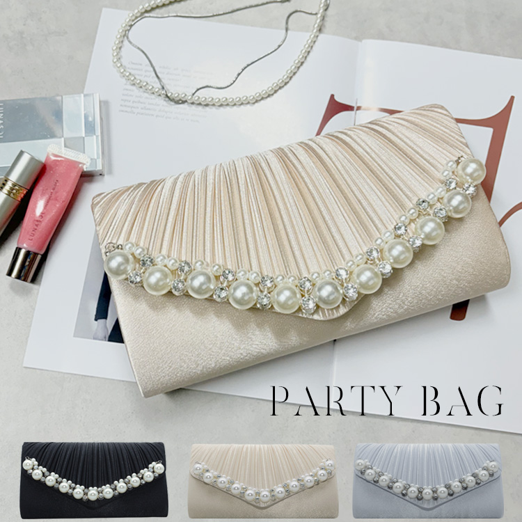 プリーツサテンフラップにパール&ジュエリーを添えた気品あるデザイン