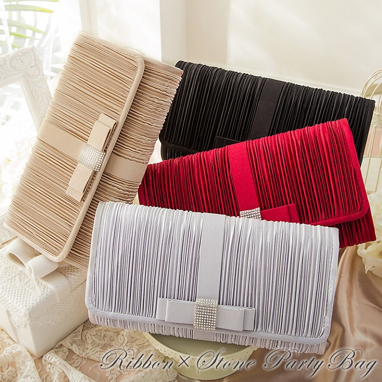 パーティーバッグ 大きめ シルバー クラッチ 結婚式 リボン プリーツ ラインストーン パーティー お呼ばれ ディナー 収納力抜群 2WAY
