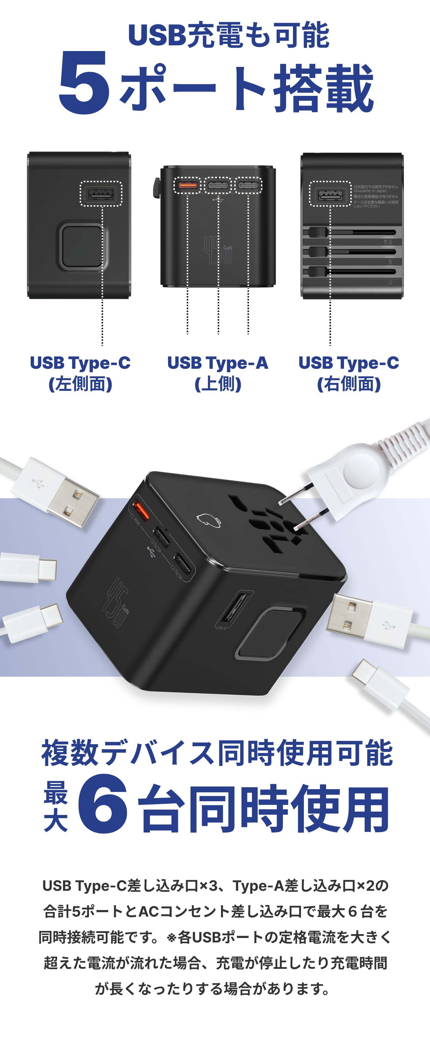 | USB-TypeA:複数接続時 合計3A |