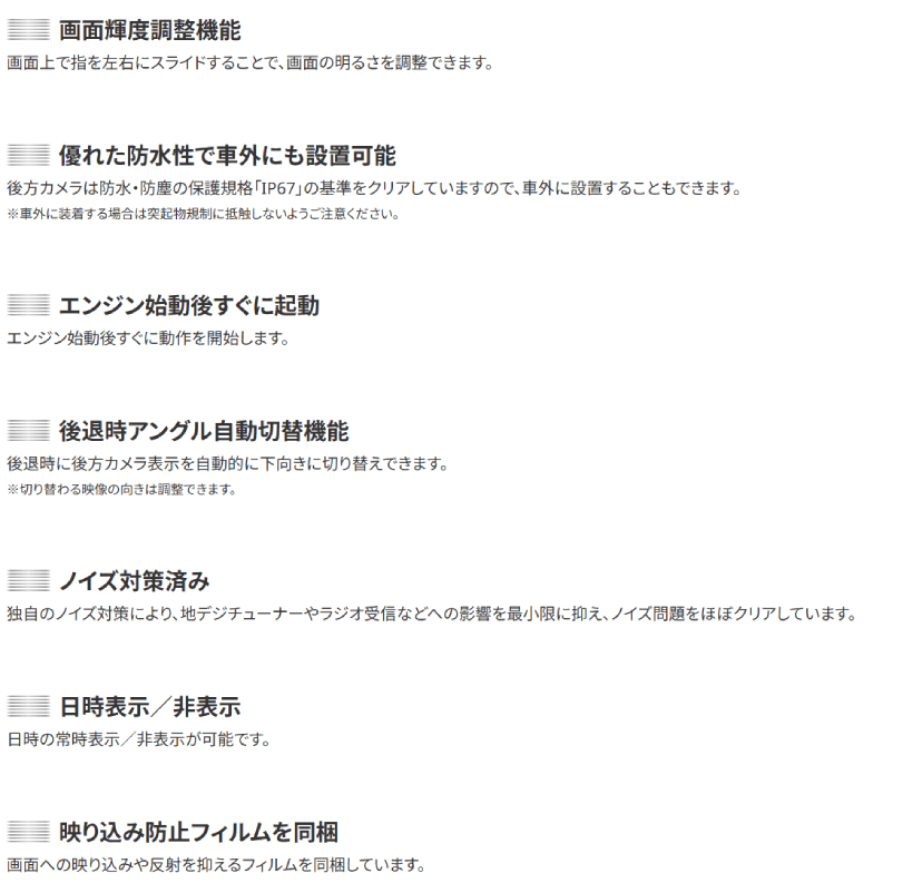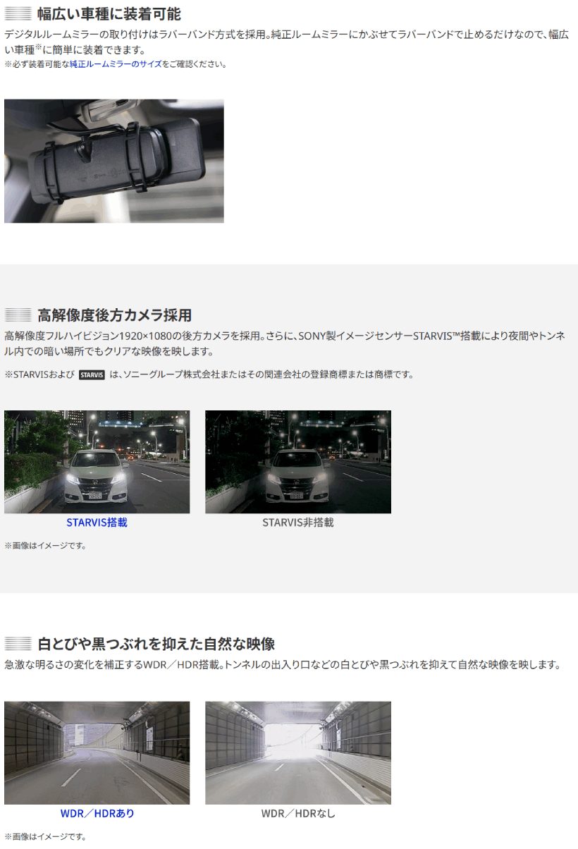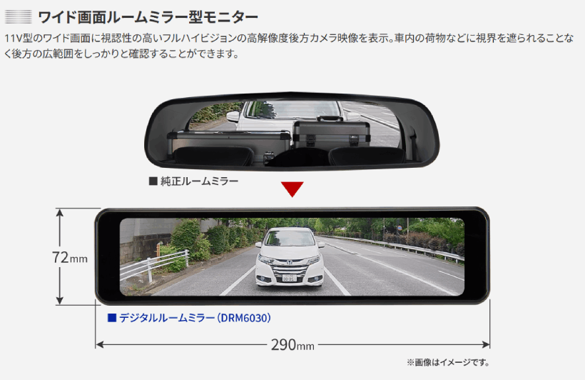 デジタルルームミラーDRM6030は、フルハイビジョン(1920×1080)の後方カメラが捉えた映像を11V型のワイドモニターに高精細表示するルームミラー型モニターです。カメラを車体後部に装着するため、車内の荷物や後部座席の同乗者に視界を遮られることなく後方の広範囲をしっかりと確認することができます。防水仕様の後方カメラは車外にも取り付け可能。SONY製イメージセンサーSTARVIS採用により夜間でも視認性の高い鮮明な映像を実現しています。