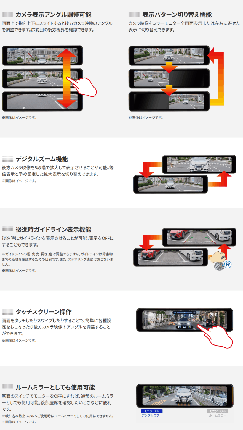 ※本機の電源をOFFにすると通常のルームミラーとしてご使用いただけます。(映り込み防止フィルムご使用時はルームミラーとしての使用はできません。)