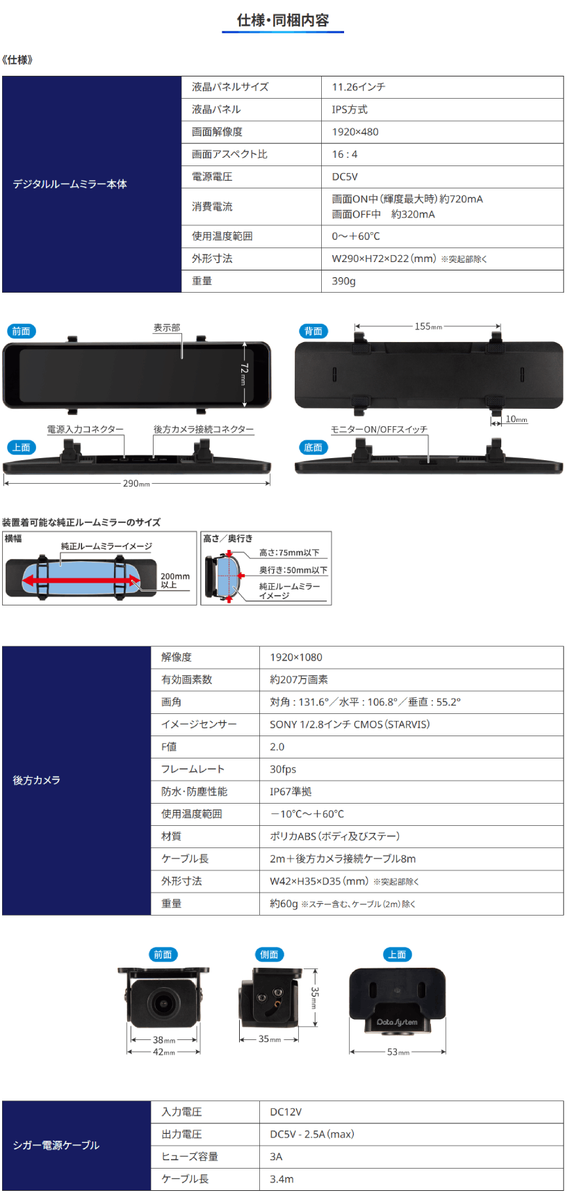 DRM6030 データシステム デジタルルームミラー 11V型ワイドモニター ルームミラー型モニター 12V車専用 ※録画機能なし