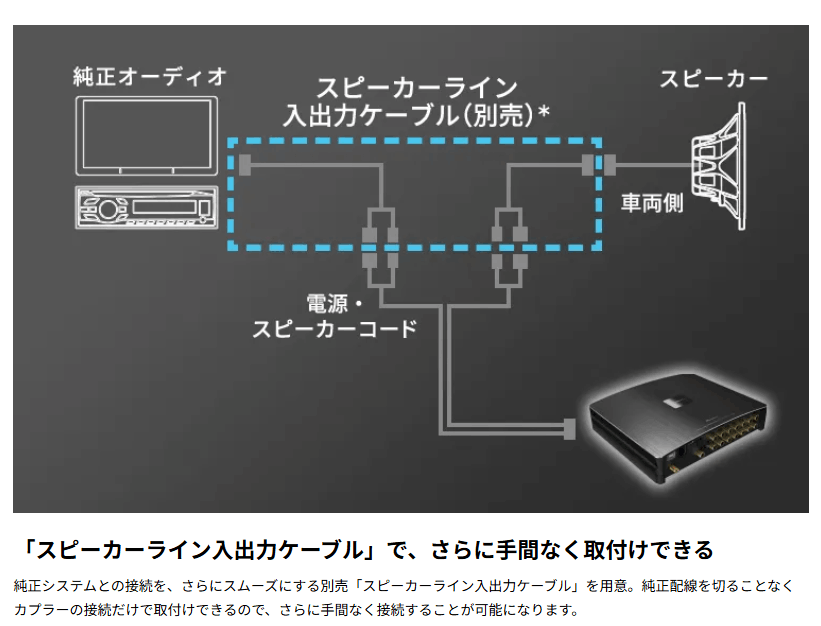 ・ 別売のスピーカーライン入出力ケーブルで、純正配線を切断せずに接続が可能※1